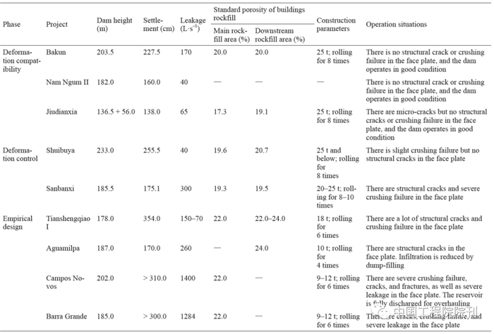 在Pinto的原图基础上,补充了水布垭等10座面板堆石坝工程,可见水布垭、巴贡等面板堆石坝并不符合Pinto结论,即单独控制堆石体变形也不尽科学,需要既控制堆石体变形总量,又控制各部位变形的协调才是合理的办法。结合巴贡面板堆石坝等工程建设,提出了变形协调设计新理念,建立了变形协调的准则、判别标准和变形安全设计计算方法,按新、老理念设计的典型工程的运行情况见表4。