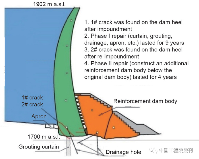 20世纪高混凝土坝的发展取得了巨大的成功,同时也有惨痛教训。胡佛、英古力、大迪克逊、伊泰普等高混凝土坝建设成绩卓著,引领了高混凝土坝的发展。奥地利科恩布莱恩(图5)、美国德沃夏克、前苏联萨扬舒申斯克等高坝都发生过严重开裂漏水,修补加固费用巨大;法国马尔帕塞拱坝因坝肩失稳发生溃决,给生命、财产带来巨大损失;中国也有高混凝土坝发生严重裂缝、高压水劈裂等影响安全的实例。