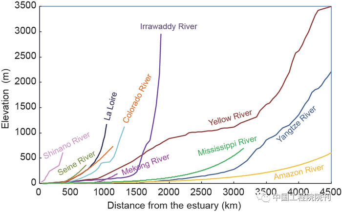 中国黄河、长江世界著名,但治理最为困难。图10比较了国际典型河流的比降。以黄河为例,1949年以前,是百年一改道、三年两决口的河流,给人民带来了深重的灾难。黄河四季流量变化大、泥沙含量多,水库淤积问题严重。黄河年输沙量1.6×109 t,为亚马逊河年输沙量9×108 t的1.8倍,多年平均含沙量达35kg·m–3,为亚马孙河的210倍。1992年调查表明黄河流域已有超过20%的水库库容被淤损。对此,采用“蓄清排浑”“异重流排沙”等方法,实现了“不淤高、不决口、不断流、水质不恶化”的黄河治理目标。
