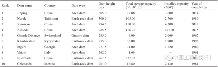 表1 世界坝高前10名大坝