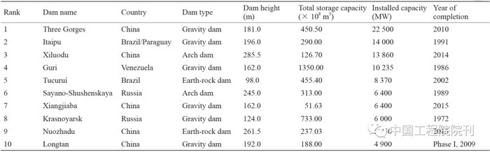表3 世界装机容量前10名的工程