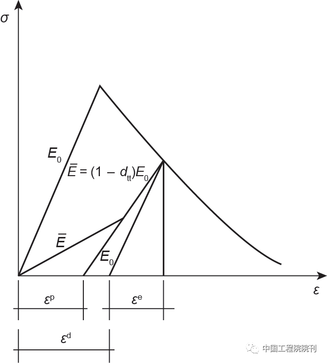 提出了同时考虑残余变形与刚度降低的混凝土损伤模型,引入“视弹性模量”(图9)和“视损伤因子”建立混凝土动态损伤本构关系[式(1)],并应用于对经受汶川地震考验的沙牌拱坝进行震情检验。