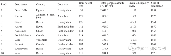 表2 世界库容前10名水库