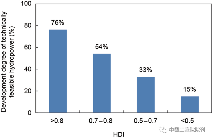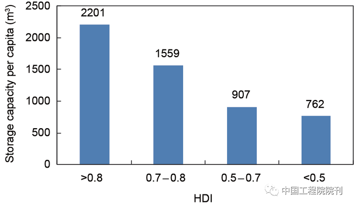 中国建设了世界上最多的水利水电工程,也采取了最严格的水资源管理制度,要求以水定城、以水定产,但由于人口众多、水资源时空分布不均,与发达国家比,依然需继续推进工程建设。基于约100个国家的数据,比较了水资源开发度与人类发展指数(HDI)的相关关系(图3、图4),HDI是衡量一个国家综合国力的重要指标。由此可见发达国家人类发展指数高(预期寿命、教育水平、人均GDP),对应的水资源开发度一般也高。2014年中国人类发展指数为0.727,水电开发度为52%,人均库容约600 m3,基本符合较发达的发展中国家的指标,说明中国的水库和水电建设与国民经济社会发展的水平总体是协调的。