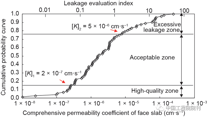 高面板堆石坝在早期发展过程中一直存在周边缝破坏漏水问题,结合水布垭面板堆石坝建设,研究提出了新的止水结构,后来归纳提出了动态稳定止水设计理念。其基本要求是在300 m高水压下,止水结构可以承受三向大变位作用,通过动态自调整形成稳定止水体系,即新的止水结构既可在正常设计工况下实现动态稳定止水,又可在非常情况下依靠具有流动止水功能的新材料弥补止水系统的缺陷。新止水设计与国外常规止水设计工程的运行效果见表5。运用面板综合渗透系数法建立了面板堆石坝渗漏评价方法,基于国内外67座面板堆石坝工程监测结果得到图8,水布垭、洪家渡等工程均居于优质区。