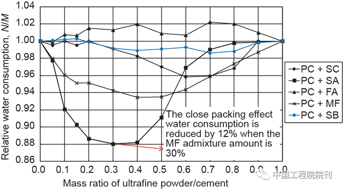 美国胡佛大坝采用低热硅酸盐水泥,每立方米混凝土成本较三峡高30%以上,难以仿用。为保障“千年大计”的三峡工程及200m以上高混凝土坝的安全建设,发现了多元胶凝粉体的紧密堆积和复合胶凝效应,提出配制高坝混凝土的新方法,解决了传统方法配制混凝土时高强度与高抗裂难以兼顾的难题,开启了高坝工程大规模使用I级粉煤灰、石灰石粉掺合料的先例。应用于三峡三期的4×106 m3混凝土,抗裂系数提升13.1%~50.0%。从图6可见当超细粉(MF)含量达到胶凝粉体20%~40%时可减少浆体用水量12%,从而可大幅度降低混凝土用水量和胶凝材料用量。