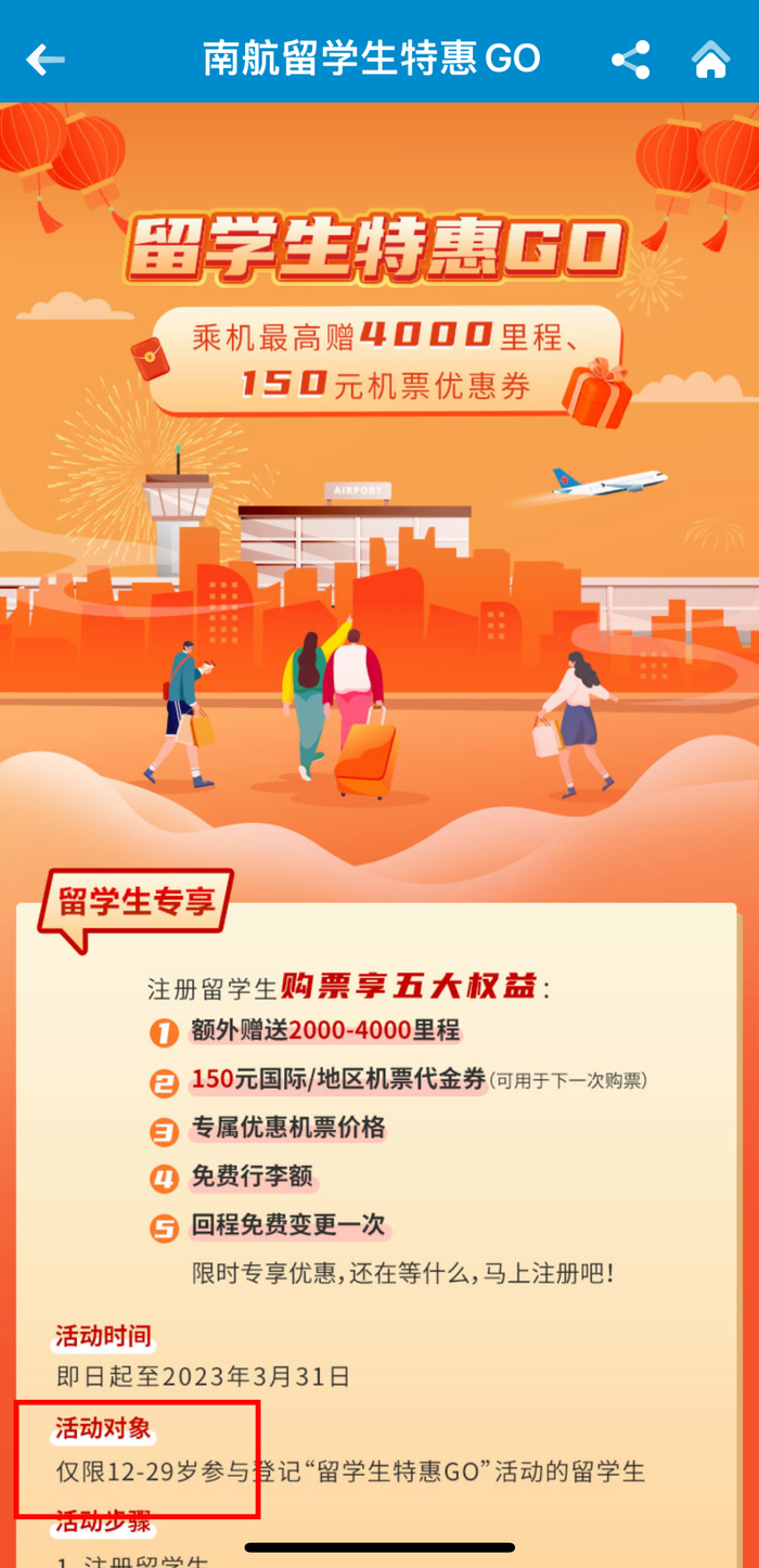 页面显示活动时间至2023年3月31日,活动对象仅限12-29岁参与登记“留学生特惠GO”活动的留学生。