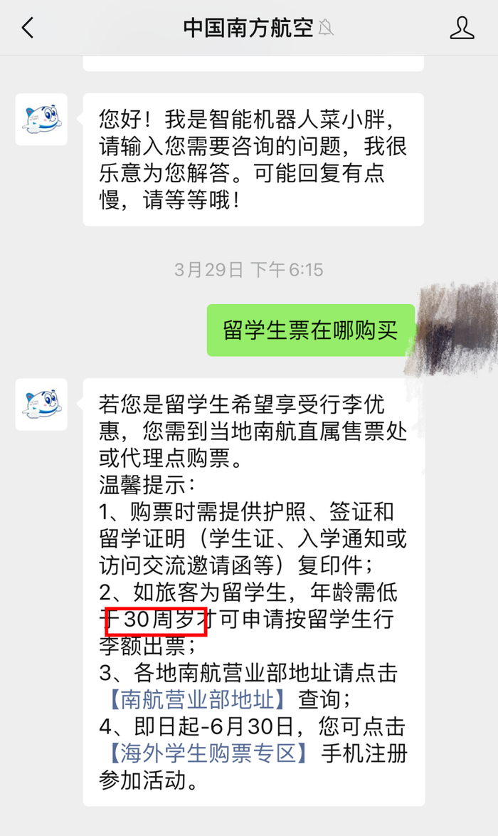 而在南方航空的微信公众号上,当记者咨询留学生机票时,智能客服回复:“若您是留学生希望享受行李优惠,需到当地南航直属售票处或代理点购票。温馨提示:……如旅客为留学生,年龄需低于30周岁才可申请按留学生行李额出票……”。