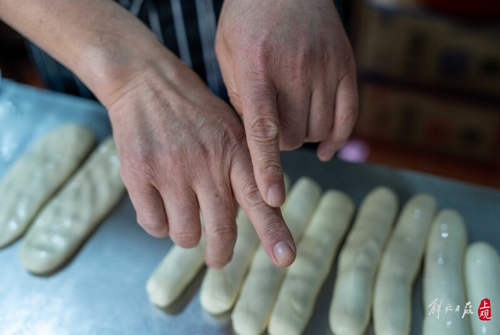直到亲眼看到王永新做饼,才明白他做的葱油饼为什么这么香。在店内的铝皮案板上,他将搓成十多个长条形面团压扁,再用擀面杖将它们擀得长而薄,表面涂上用猪油、面粉和调料做成的油酥,边涂边拍边压实,让油酥的味道充分沁入面皮。因为常年重复这个涂油酥的动作,王永新最受力的右手食指有些扭曲。