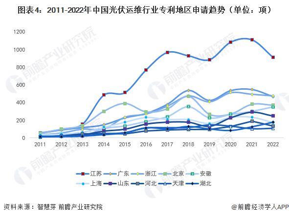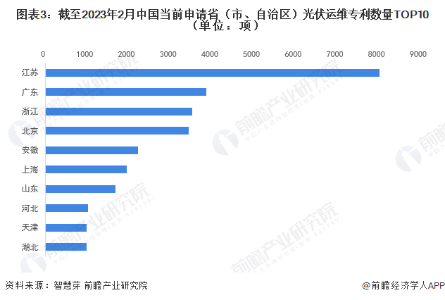 (3)中国区域专利申请分布:江苏省光伏运维专利数量超过8000项