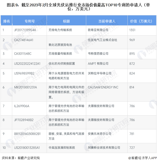 在全球光伏运维市场价值最高TOP10专利中,价值最高的是欧希亚有限公司,其专利“JP2017139954A 无线电力传输系统”价值高达1351万美元;住友电气工业株式会社的“CA2748146A1 氧化还原液流电池”专利价值为1351万美元。