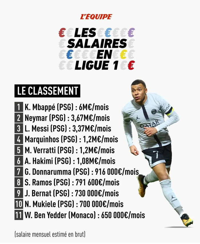 根据《队报》统计,本赛季巴黎圣日耳曼创下了职业足球俱乐部有史以来最高的年度工资账单,一线队球员月平均薪资101.6765万欧,全队工资总额达到了7.28亿欧元,占据了整个法甲薪资总额的37%。