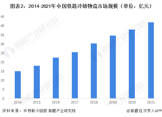 按中国铁路冷链运输方式占所有运输方式的1%比例计算,2020年中国铁路冷链物流市场规模约为38亿元,到2021年中国铁路冷链物流市场规模约为42亿元。