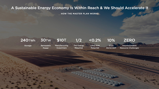 通过数据计算,与化石能源经济相比,由电力驱动的新能源经济能够节省大概一半的资源,仅需全球不到0.2%的陆地面积来收集风能和太阳能便可运转。