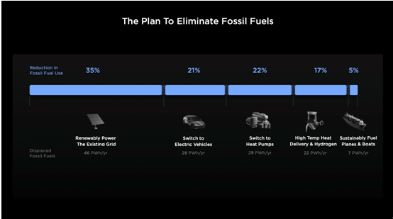 秘密宏图第三篇章把“实现可持续能源经济”这一目标拆解成五个部分:用可再生能源驱动现有电网;全面转向电动车;在家用、商用和工业领域使用热泵;在工业领域使用高温储能及绿色氢能;在飞机和船舶上应用可持续能源。可以预想,如果全球0.2%的面积都覆盖以Megapack为代表的清洁能源设施,便可跑通“用可再生能源驱动现有电网”这一可持续能源经济的必经之路。