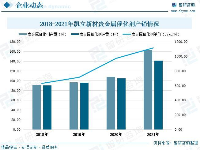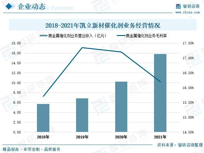 凯立新材公司主要从事贵金属催化剂的研发与生产、催化应用技术的研究开发、废旧贵金属催化剂的回收及再加工等业务,公司贵金属催化剂产品达数百种,主要以铂族金属(铂、钯、钌、铑、铱等)为催化活性组分,在此基础上公司也在不断加强其它新型催化剂的研究开发。公司目前客户主要分布于医药、化工新材料、农药、染料及颜料等领域,同时大力拓展基础化工、环保、新能源等新领域。近年来,凯立新材的贵金属催化剂业务收入逐年增加,尤其在2021年出现明显上涨,贵金属催化剂业务营业收入达到15.8亿元,增速54%,比2018年贵金属催化剂年收入提高10.1亿元。2018-2021年,公司的贵金属催化剂毛利率的区间范围为15.71%-17.35%。