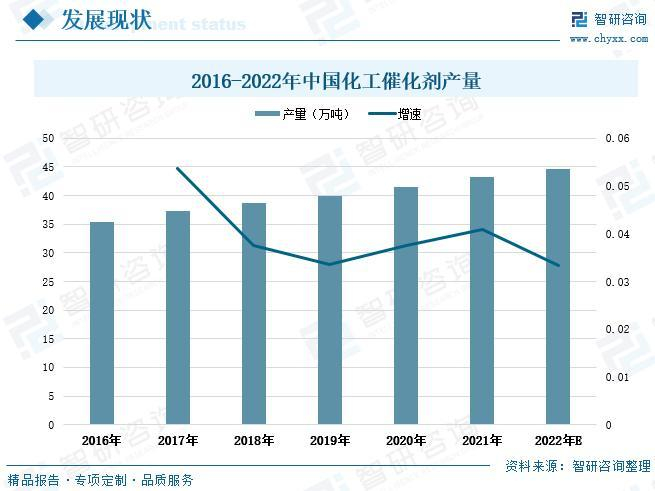 科、相互渗透、交叉应用的特点,生产工艺复杂,技术难度高。当前催化剂行业领先企业主要为国外大型化工企业,我国在大部分催化剂领域仍与国际先进技术水平存在较大差距。随着我国催化剂产业政策支持力度不断加大,经济结构调整进程逐步深化,对催化剂等关键材料的自主供给重视度提升,国内催化剂制造企业科研和生产能力不断增强,产能不断优化升级,逐步实现在催化剂部分领域的国产替代。根据统计数据显示,2021年全国化工催化剂产量达到43.2万吨,增速4.1%,较2016年全国化工催化剂产量增加6.3万吨。预计2022年全国化工催化剂产量将达到44.6万吨。