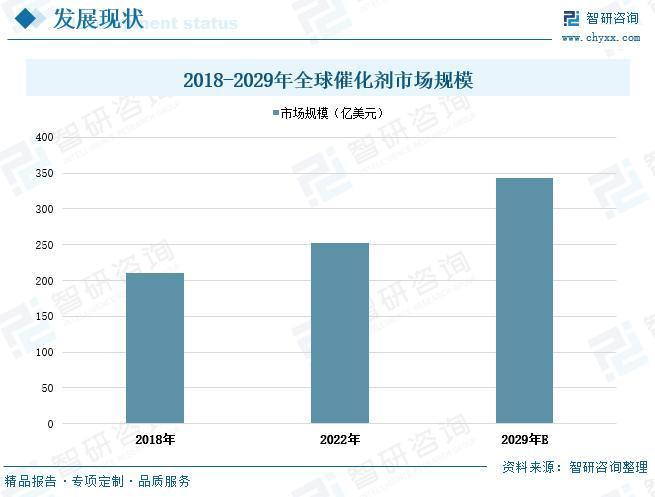 催化剂作为影响化学反应的重要媒介,在全球各行各业广泛使用,除传统的石油化工产品制造领域以外,已在清洁能源的开发与利用、环境保护以及人类的生存环境的治理与保护等多个新兴领域起到了关键作用。根据统计数据显示,2018年全球催化剂市场规模达到210.56亿美元,到2022年全球催化剂市场规模增长至252.99亿美元,其中2018-2022这五年期间年的复合增长率CAGR为4.70%。随着催化剂应用领域不断广泛以及催化剂下游产业规模不断增加,未来全球催化剂市场规模将呈持续增长态势。若2022-2029年期间市场规模以4.78%的年复合增长率增长,预计2029年全球催化剂市场规模将达到342.91亿美元。