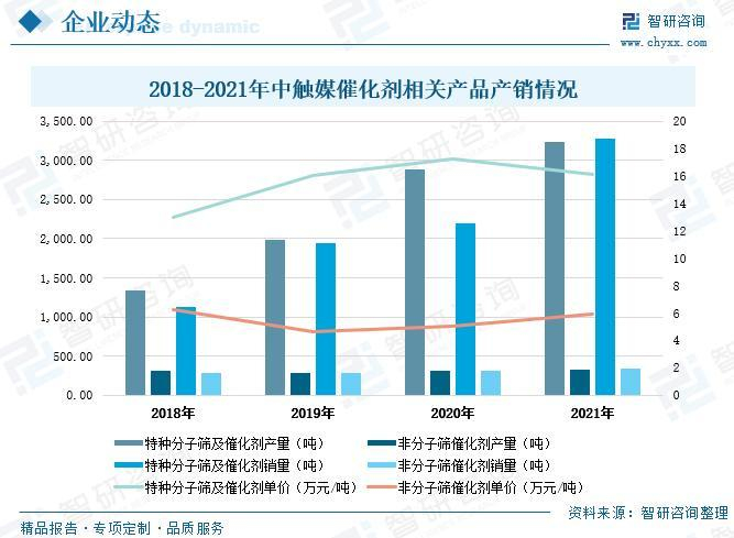 从行业重点企业经营情况来看,中触媒是我国工业催化剂生产领域的主要厂商之一,主要从事特种分子筛及催化新材料产品的研发、生产、销售及化工技术、化工工艺服务。公司主要产品为特种分子筛及催化剂、非分子筛催化剂、催化应用工艺及化工技术服务三大类,应用领域包括环境保护、能源化工、精细化工等多个行业,其中特种分子筛及催化剂为公司的主要收入来源。近年来中触媒公司经营态势持续向好,催化剂相关业务收入保持连年增长。2018-2021年期间,公司的特种分子筛及催化剂系列产品营业收入由1.47亿元上升至5.27亿元,特种分子筛及催化剂系列产品年收入增幅达到3.8亿元;同时,非分子筛催化剂系列产品营业收入由0.18亿元上升至0.2亿元,期间非分子筛催化剂系列产品年收入增加了0.02亿元。从催化剂细分产品盈利情况来看,与其他催化剂相比,由于特种分子筛及分子筛催化剂具有更高的性能与成本优势,在所服务的应用中能明显提高所需产品的产率和选择性,因而具有更高的价格和利润率。近年来,公司的特种分子筛及催化剂产品收益良好,产品毛利率不断提升,2021年公司的特种分子筛及催化剂毛利率达到45.85%,较2018年提升10.8个百分点。2021年,公司的非分子筛催化剂毛利率有所下滑至19.95%,较2018年减少14.2个百分点。