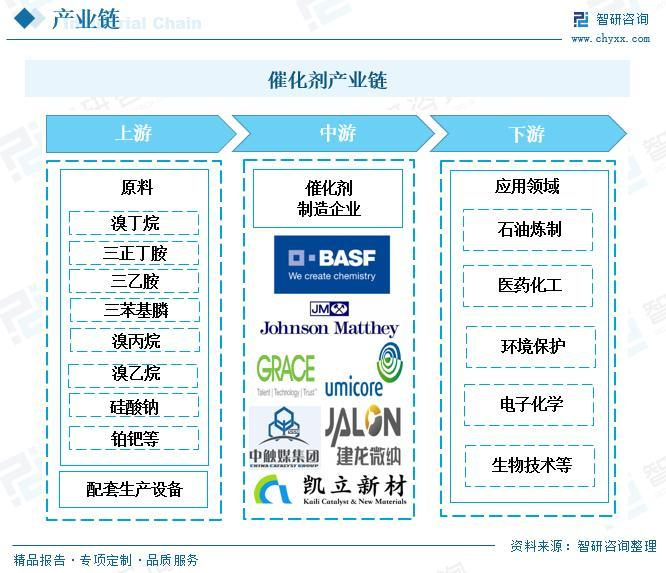 从产业链角度来看,催化剂上游原料主要包括硅酸钠、稀土、硅胶、液碱、活性炭、硫酸、氢氧化铝以及铂钯等;下游应用领域包括化工、石化、生化、环保等多个领域。