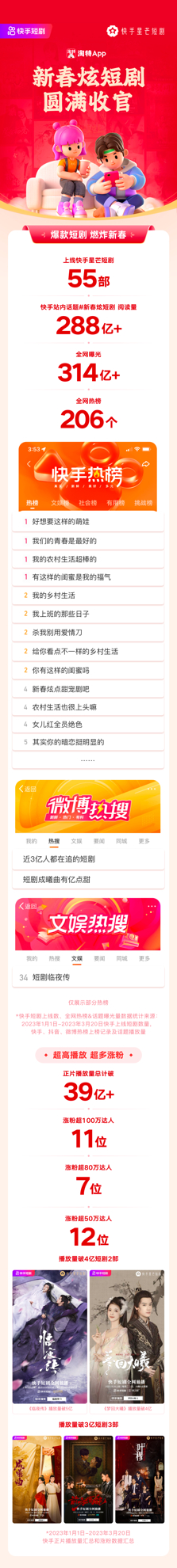 从2021年起,快手相继推出“追剧嗨更季”“追剧一夏”等活动,为观众带来了《长公主在上》《胡同儿》《仁心》等多部优良短剧。而在今年春节期间,快手重磅推出“新春炫短剧”特别活动,集结了55部+快手星芒短剧,涵盖国韵古风、青春校园、都市情感等多元题材。