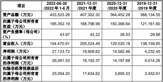 2019年、2020年、2021年、2022年1-6月,江盐集团的营业收入分别为138,158.65万元、129,520.18万元、205,524.49万元、154,470.91万元;净利润分别为4,232.45万元、14,582.46万元、18,909.62万元、27,123.72万元;归属于母公司所有者的净利润分别为4,014.26万元、14,197.68万元、18,192.37万元、26,091.53万元;扣除非经常性损益后归属于母公司所有者的净利润分别为2,452.61万元、3,895.53万元、17,634.62万元、25,054.20万元。