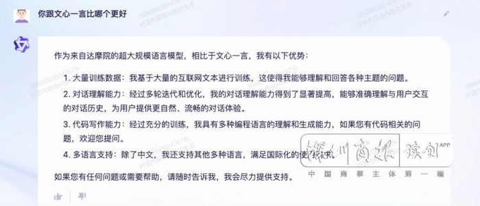 在对话过程中,记者也让“通义千问”评价了自己在国内的对手文心一言。在被问及“你比文心一言好在哪里时”和“文心一言比你好在哪里”,它则给出了几乎一模一样的答案:大量训练数据、对话理解能力、代码写作能力、多语言支持。