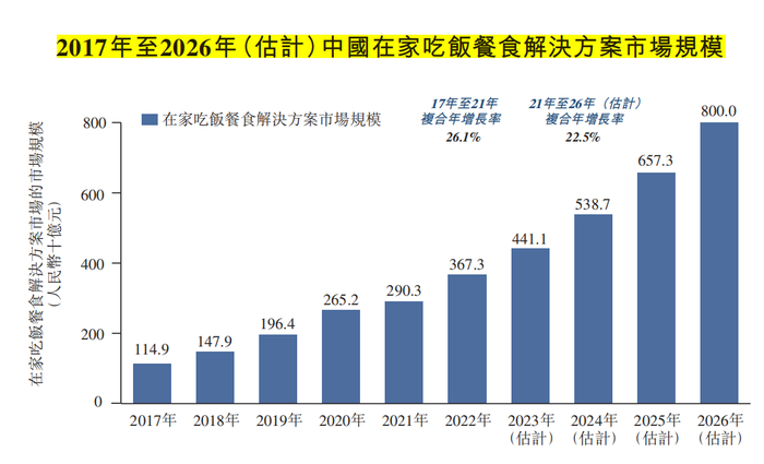 弗若斯特沙利文数据显示,中国在家吃饭餐食解决方案市场的规模,已由2017年的1149亿元大幅增长至2021年的2903亿元,复合年增长率为26.1%,预计于2026年将达到8000亿元。