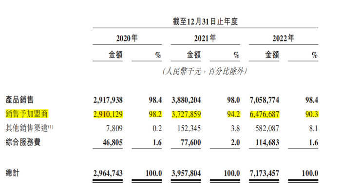 其次,招股书中提到,锅圈产品的销量主要依靠大量加盟商。从销售渠道收入来看,2020年-2022年,锅圈从加盟店渠道获得的收入分别为29.1亿元、37.3亿元以及64.8亿元,连续三年占比都超过90%。也就意味着,锅圈业绩严重依赖加盟门店的扩张和销售情况。