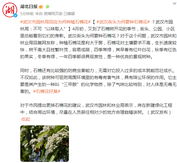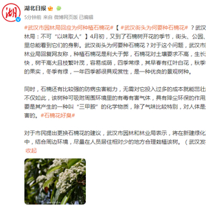 对于市民提出更换石楠花的建议,武汉市园林和林业局表示,将在新建绿化工程中,结合周边环境,尽量在人员居住相对少的地方合理栽植该树。