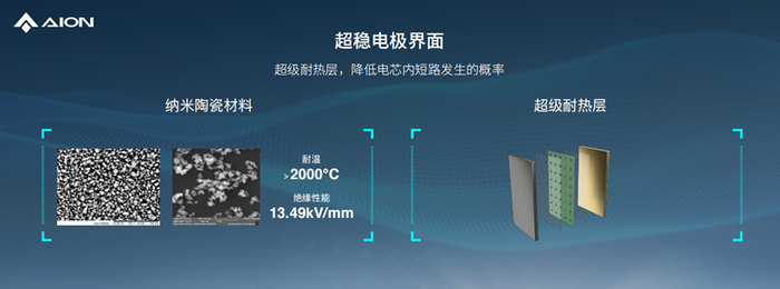 对于锂离子电池而言,电极界面是电芯内活性最高的区域。为了加强电极界面的稳定性,弹匣电池2.0开发出“超稳电极界面”技术。通过具有超高稳定性、超高耐热性的纳米陶瓷材料,大幅增加了电极界面韧性;复合集流体材料的应用,可以在热量聚集时快速坍缩,避免持续短路;同时,埃安还在弹匣电池2.0的电解液中加入了耐氧化阻燃剂,高温激活后,可捕获燃烧反应的自由基,断绝持续燃烧的条件。在三重技术的防护下,电芯即便发生热失控,其升温速率也能降低20%。