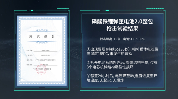 埃安此次弹匣电池2.0枪击试验是迄今最严苛的电池安全试验,在15米处对预留射击开口的满电电池整包进行射击。相较于大众熟知的针刺试验,枪击试验模拟了更加极致严苛的场景。当子弹穿透电芯时,速度可达针刺的97.5万倍,创口直径是针刺的7-8倍,可瞬间击穿多个电芯并造成热失控和爆裂性破坏。面对如此严苛的挑战,行业主流的磷酸铁锂单体电芯和行业主流磷酸铁锂模组均发生了明显的热失控和燃烧现象,这就意味着,光靠电芯本征特性无法实现真正的安全。而弹匣电池2.0整包枪击后未发生起火和爆炸,拆开电池系统外壳后,整体结构完整,仅有三个电芯爆裂性损坏,静置24小时后温度恢复至常温,顺利通过了枪击试验。这也是全球范围内,动力电池首次在枪击试验中实现不起火、无爆炸。