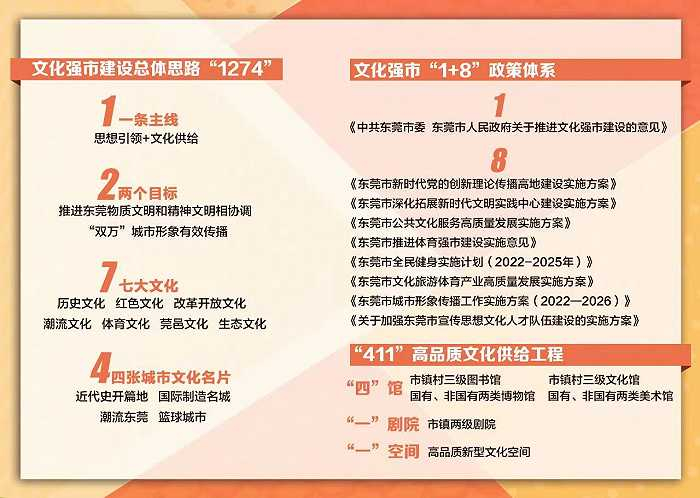 今年3月,东莞高调召开文化强市建设大会,明确文化强市“1274”总体思路和“1+8”政策体系,未来东莞将打造“411”高品质文化供给工程、“十大文化品牌”“十大文体设施”、城市标识等重大项目。