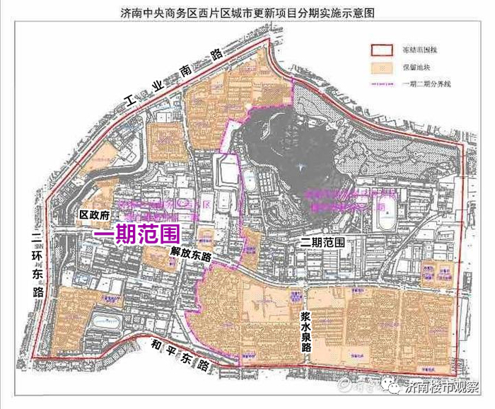济南CBD以西区域拆迁范围很广,下图中除橙色区域之外,其他区域都在拆迁征收的范围内,目前正在实施的是西侧一期工程。