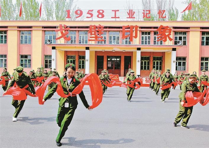 在八师石河子市石河子戈壁印象文化和旅游园, 游客穿上绿军装一起扭秧歌,体验军垦生活(资料图片)。2022年,文旅部公布国家工业旅游示范基地名单,石河子戈壁印象文化和旅游园榜上有名。 石河子戈壁印象文化和旅游园 提供
