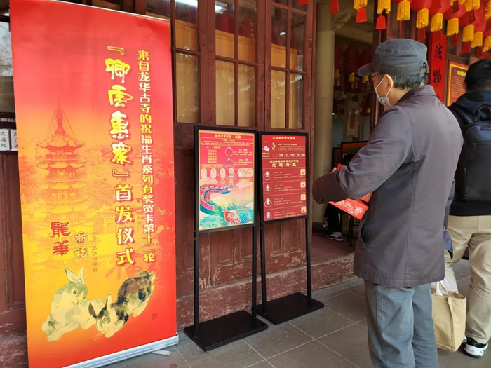 线下比如龙华寺法物流通处门口立着产品易拉宝。