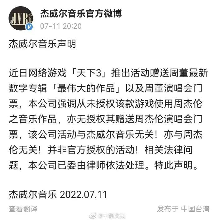2022年7月,杰威尔音乐官方微博曾发布声明,回应网游《天下3》推出活动赠送周杰伦新专《最伟大的作品》以及演唱会门票之事,杰威尔强调:“本公司从未授权该款游戏使用周杰伦之音乐作品,亦无授权其赠送周杰伦演唱会门票,该公司活动与杰威尔音乐无关,亦与周杰伦无关!并非官方授权的活动!”并表示相关法律问题已委由律师依法处理。