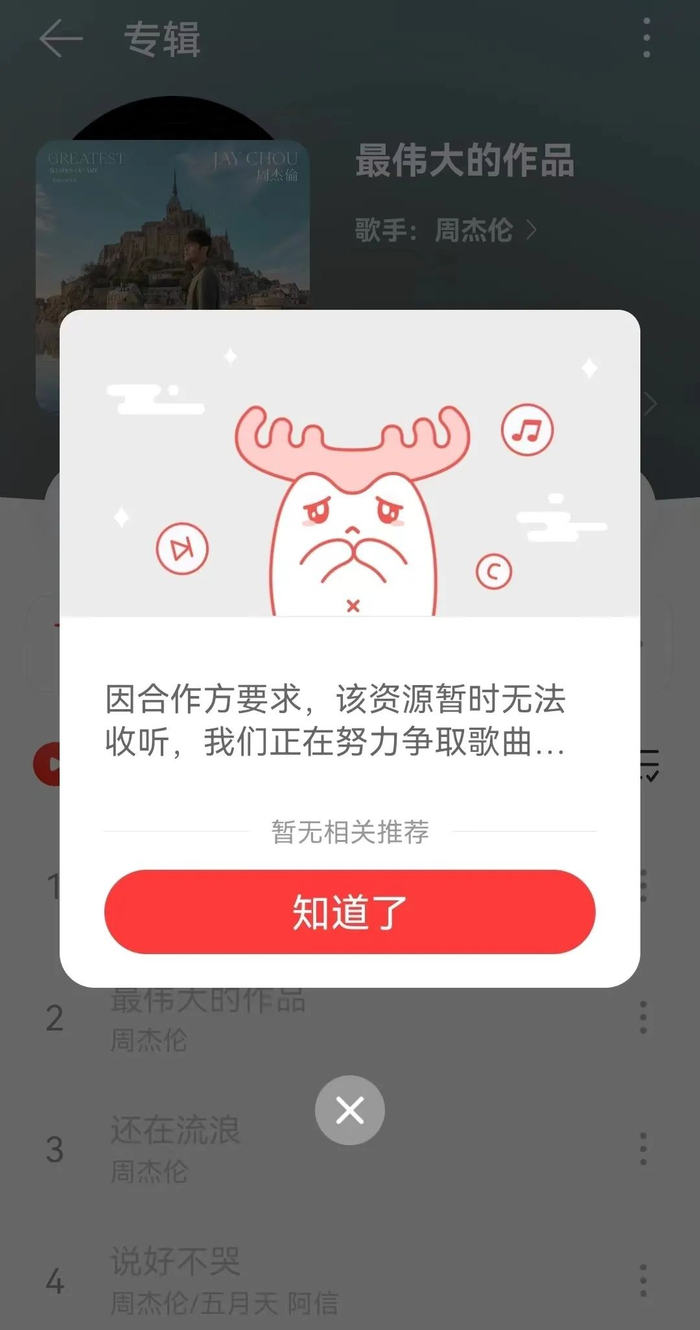 从当年3月31日开始,大量网易云音乐用户收到官方通知,称由于版权问题,将下架涉及周杰伦等艺人的杰威尔公司版权的歌曲。
