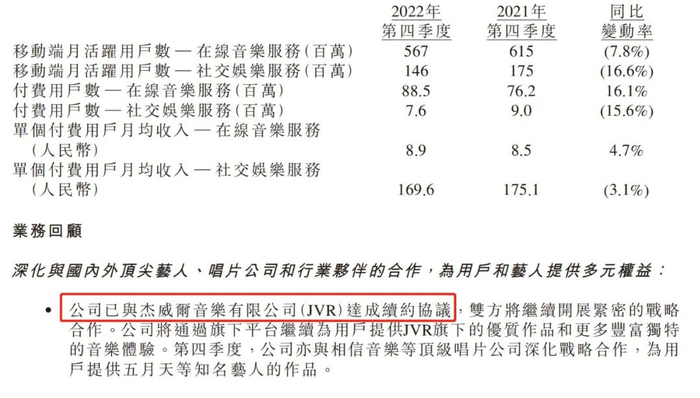 今年3月21日,腾讯音乐(HK1698)发布2022年报,与周杰伦版权持有方杰威尔的续约也被写进年报。腾讯音乐娱乐集团(TME)宣布,已与杰威尔音乐有限公司(JVR)达成续约协议,双方将继续展开紧密的战略合作。