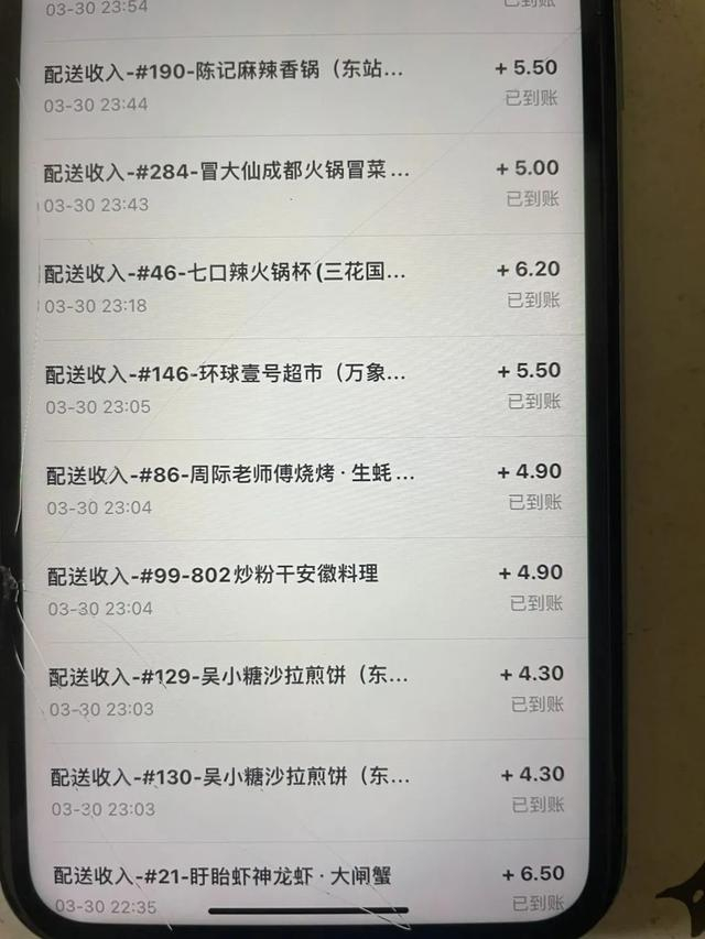 根据黎父提供的小黎手机上的送单记录,记者看到小黎从3月30日晚10点03分开始接单,直到3月31日凌晨事发,5个小时完成了32单的配送,收入291.5元。