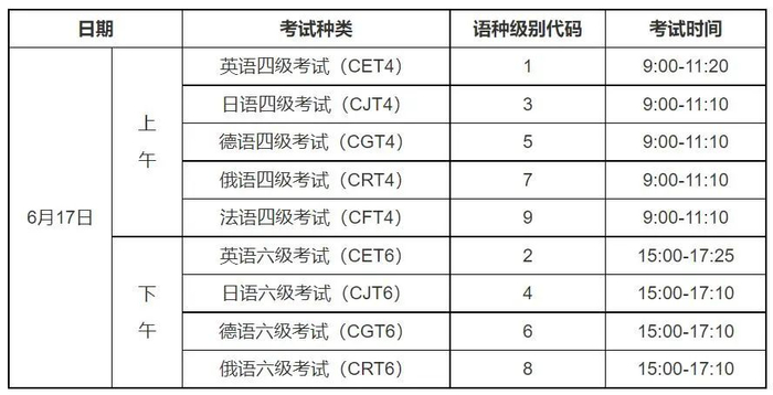 2023年上半年全国大学英语四、六级考试口试于5月20日开考英语四级,5月21日开考英语六级;笔试于6月17日上午开考四级(英语、日语、德语、俄语和法语),下午开考六级(英语、日语、德语和俄语)。