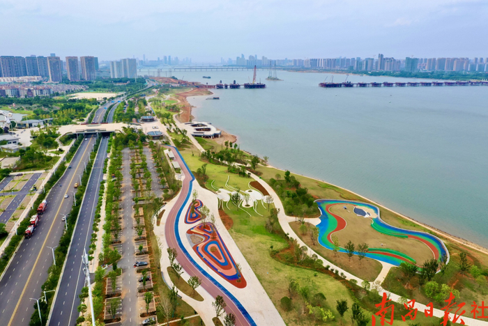 赣江市民公园一二三四期如春笋般冒出,屹立于赣江之畔。待五期全部完工,将在赣江西岸构成一条长达28公里的生态优良、景色优美的绿色生态廊道,为市民提供休闲放松、运动健身的公共空间。