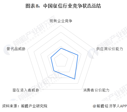 从五力竞争模型角度分析,目前中国征信行业竞争者数量少,未有大型上市公司,市场集中度较低;信贷机构有义务向央行报送征信数据,因此上游数据供应商缺乏议价能力;中国征信市场仍有用户需求未被满足,对潜在进入者吸引力强,但监管严格,进入门槛较高,总体来看,潜在进入者威胁较小;互联网和大数据技术的广泛应用,大量有效的替代数据可作为信贷数据的补充,并纳入征信信息范围,替代品威胁较小。基于以上分析,中国征信行业竞争状态总结如下: