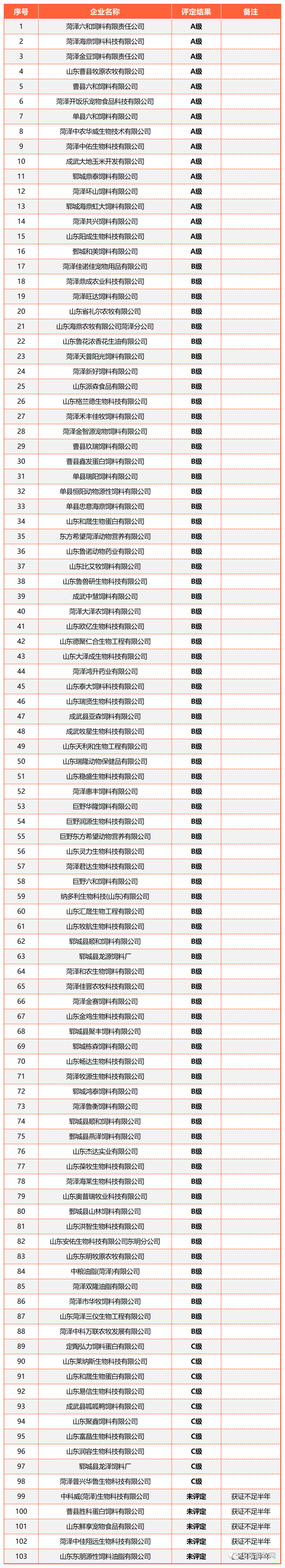 十六、菏泽市103家(A级16家、B级72家、C级10家、未评定5家)