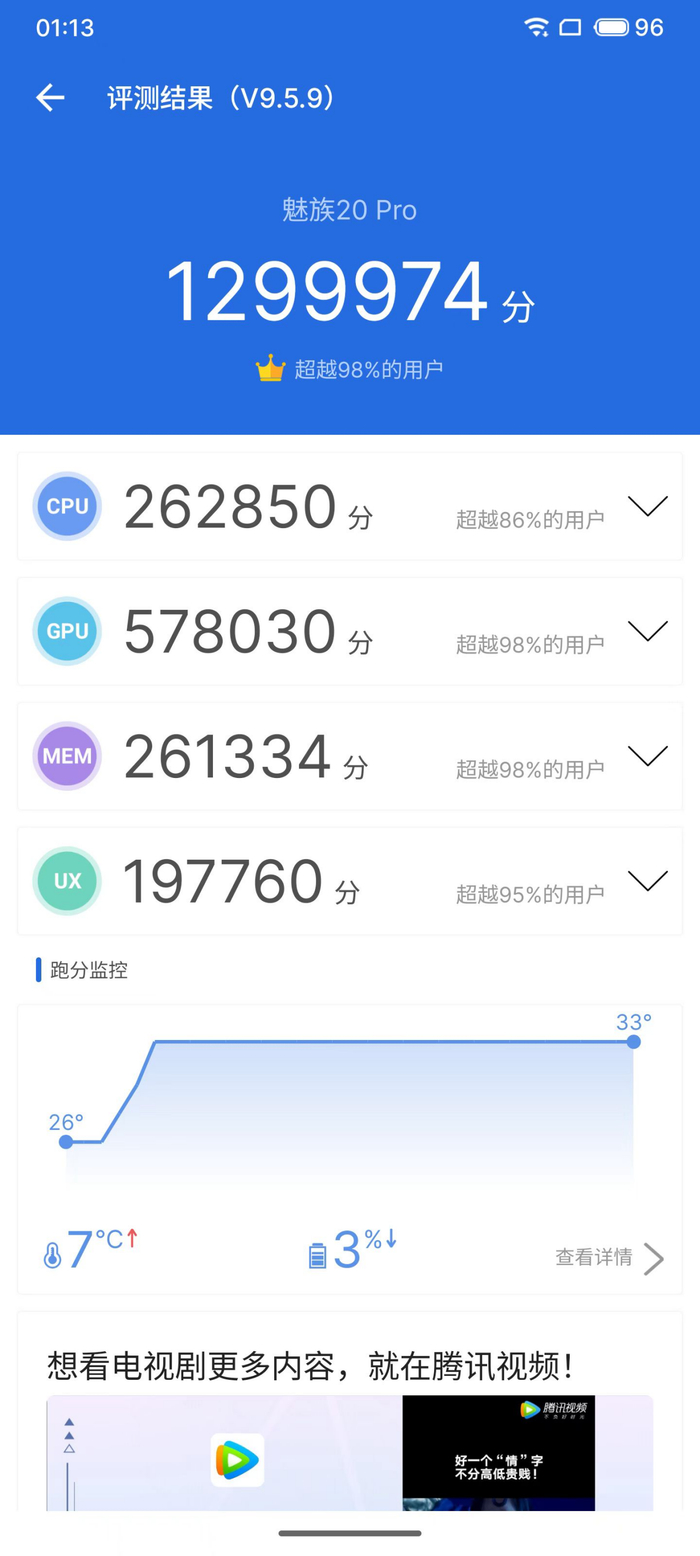 性能方面,魅族 20 PRO采用了第二代骁龙8移动平台,配备LPDDR5X运存和UFS4.0闪存,硬件规格均属当前国产手机的顶配,我们使用魅族 20 PRO运行半小时某⼤型游戏,期间帧率表现稳定,机身温度适中。