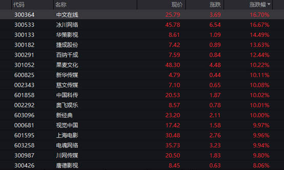 果麦文化、冰川网络、华策影视等多股盘中涨幅超过10%,新华传媒、慈文传媒、上海电影等10多只股票盘中一度触及涨停,总体上看,该板块内盘中一度有超过20股涨停或涨幅超过10%,这里面有多股近日更是连续涨停,部分个股近日因而发布股价异常波动公告。
