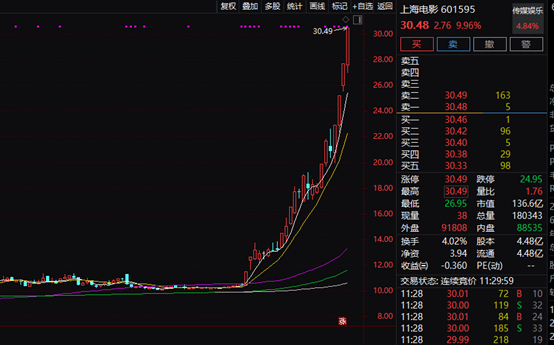 比如上海电影近日股价连续大涨,昨天和前天收盘股价均封住涨停,今天上午盘中一度再涨停。