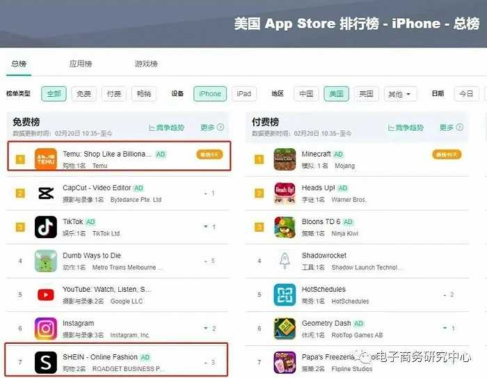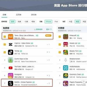 数据显示,截止2023年3月,苹果App Store上下载最多的三个免费应用程序是Temu、CapCut(TikTok视频编辑器)和TikTok;Google Play商店中下载最多是Temu、TikTok和Shein。