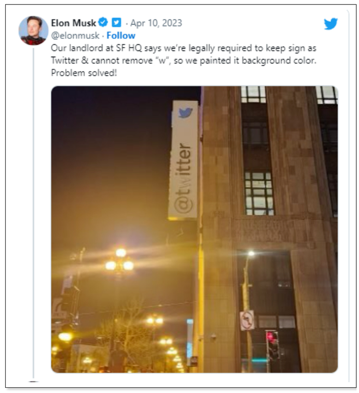 报道提到马斯克的推文称,推特公司租用的旧金山总部大楼的房主称,法律要求“保留Twitter标志并且不能删除‘w’ ”,所以大楼上推特标识中的字母“w”,被涂成了与背景板相同的颜色。“问题解决了!”马斯克写道。