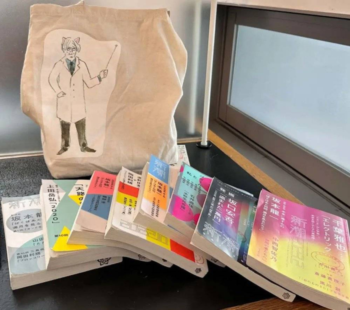 全部8期的《新潮》杂志,背景的帆布包是2015年坂本龙一的咽喉癌治愈后,为了庆祝复出推出的纪念周边,无疑正是“教授”的形象(图|库索)
